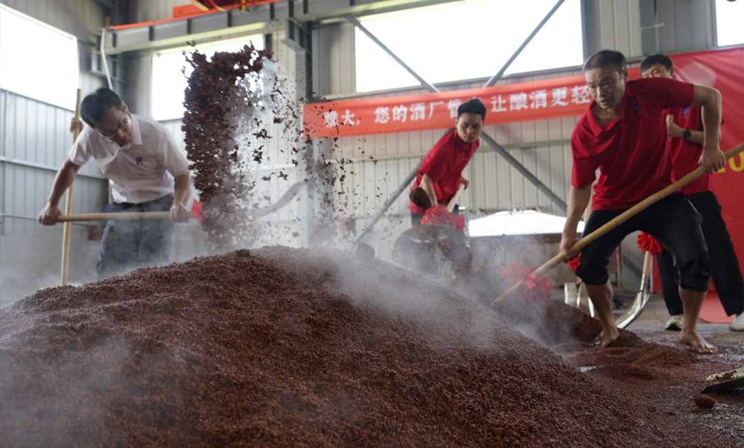 覃佐东院长俯身细看粮堆的湿度,连连赞叹:“温度与湿度的微妙平衡,正是工艺精髓所在! ”一旁的雅大技术总监蒋建明适时讲解:“下沙是酱香酒生命周期的起点,需经历九次蒸煮、八次发酵, 七次取酒方能成就层次丰富的酒体。”