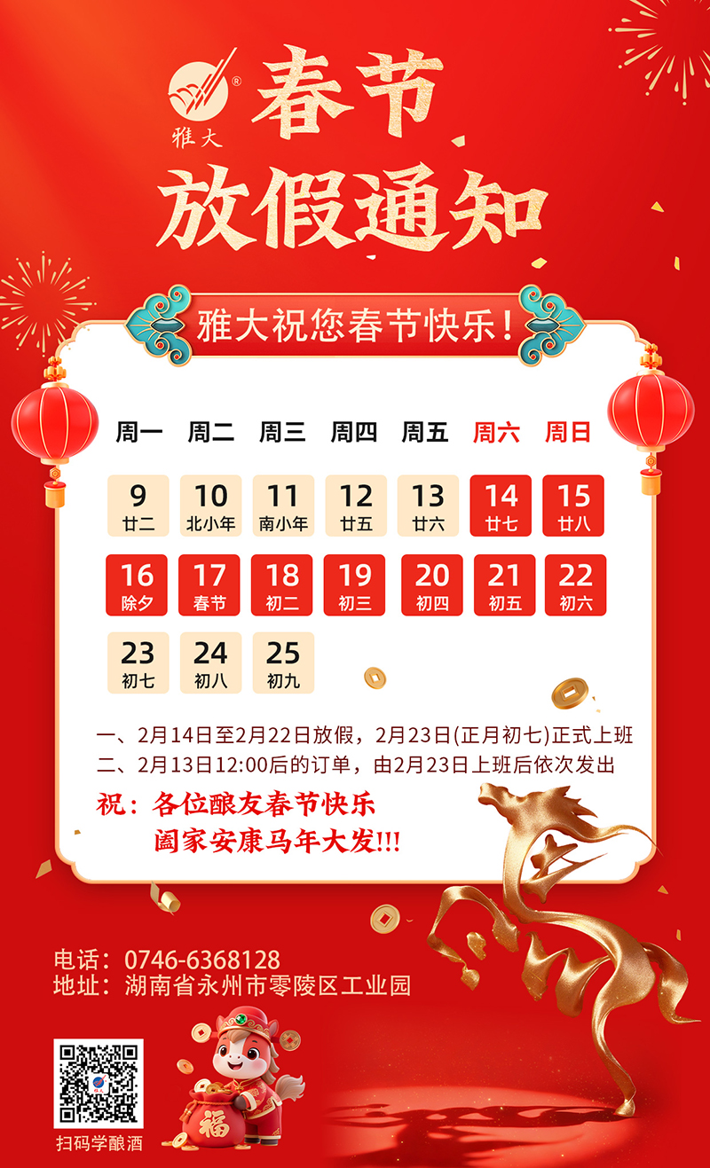 新春佳节即将来临,值此辞旧迎新之际,雅大公司全体员工谨向您致以节日的诚挚问候!为让大家共同度过一个温馨、团圆的春节,现将我司2026