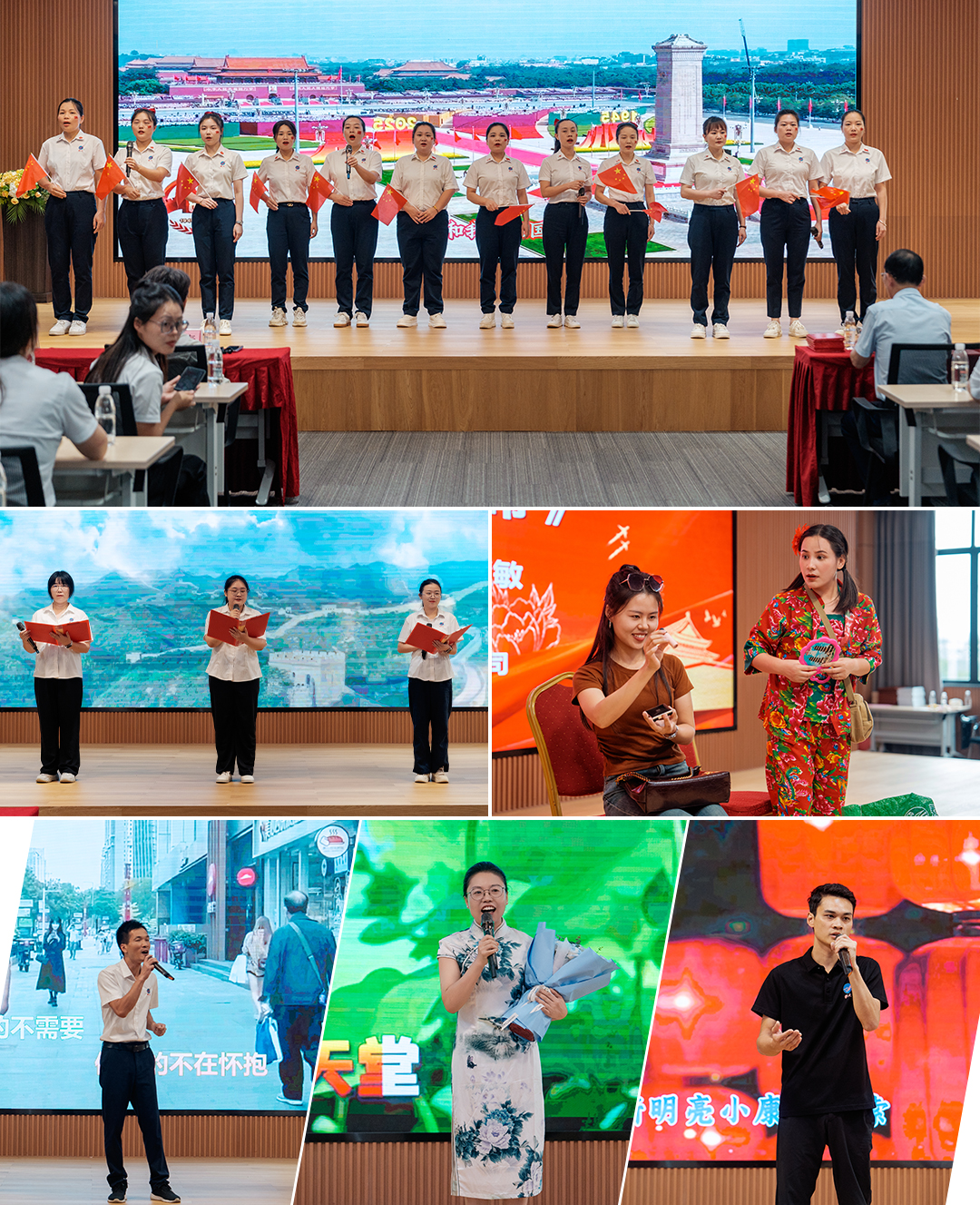紧接着,精彩纷呈的文艺汇演和互动环节将活动推向一个又一个高潮。酒曲营销部的合唱《我和我的祖国》,以深情的歌声表达对祖国的无限热爱与祝福;运营部的诗歌朗诵《我的祖国》,声情并茂,抒发了炽热的家国情怀;党工青妇代表莫材农独唱的《我把故乡比苏杭》,旋律优美,引人入胜;生产部与设备厂的《烦恼歌》轻松活泼,设备营销部的《灯火里的中国》大气磅礴,均赢得满堂喝彩;财务部与雅大酒业联合呈现的小品《花开并蒂》,幽默诙谐又寓意深刻,充分展现了员工们多才多艺的一面。