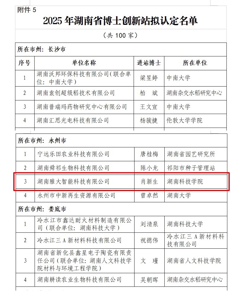 近日,据湖南省科学技术协会z6尊龙平台官网通告,湖南雅大智能科技有限公司,成功获湖南省院士专家工作站建设专项办公室批准为湖南省博士创新站!这是对雅大的肯定和认可,彰显了我公司在科技创新与人才培养上实现新跨越,为企业长远发展注入强劲新动力。